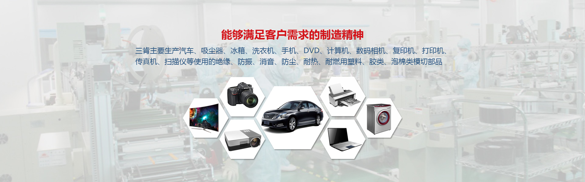 主要生产汽车毛毡类的热压产品及材料,针刺毛毡,无纺布以及家电办公类设备使用的绝缘、防振、消音、防尘、耐热、耐燃用塑料、胶带、泡棉类模切部品。